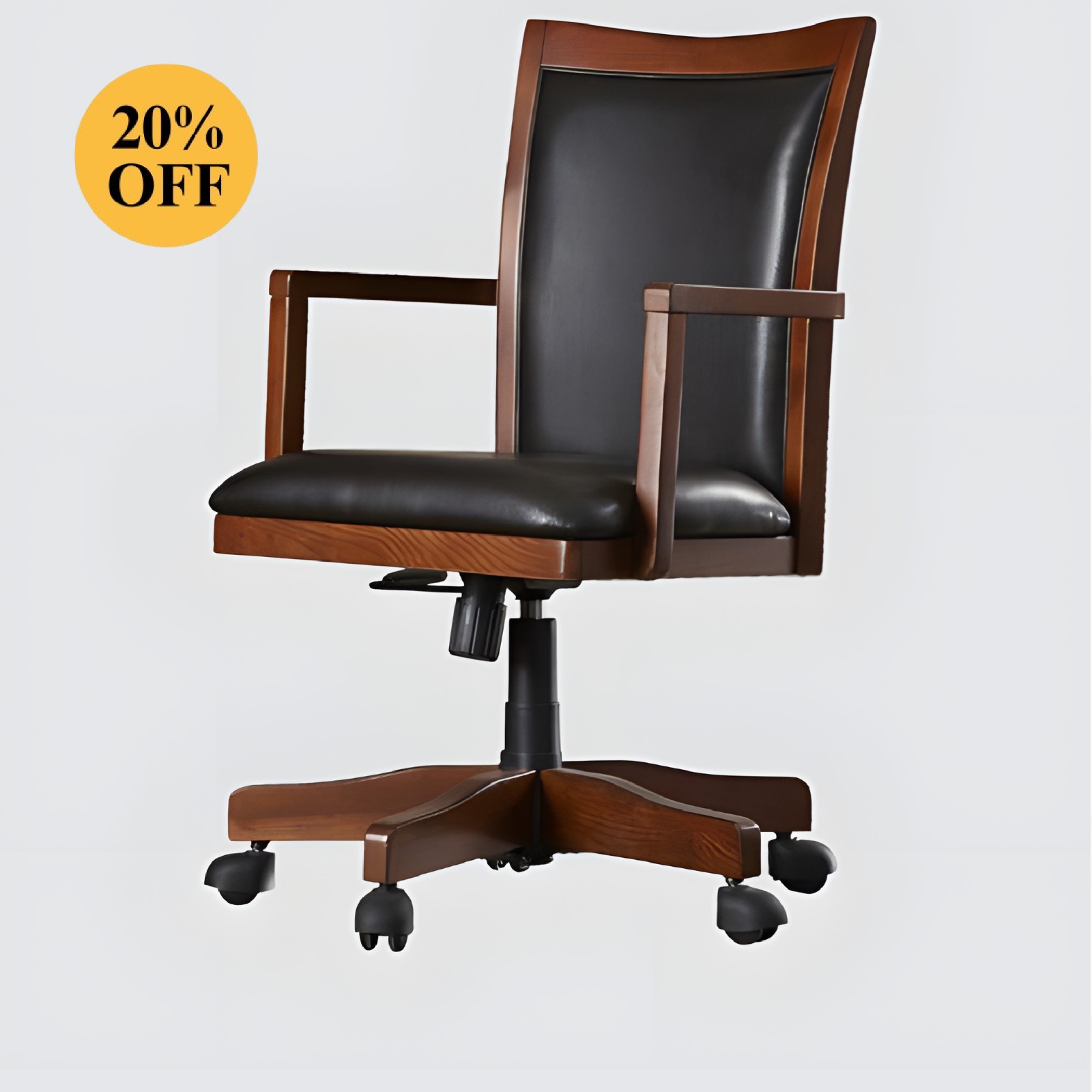 Executive revolving chair, structure made of solid seasoned wood with high-quality lacquer polish finish, upholstered in leatherette, tilt mechanism with two stages lock.