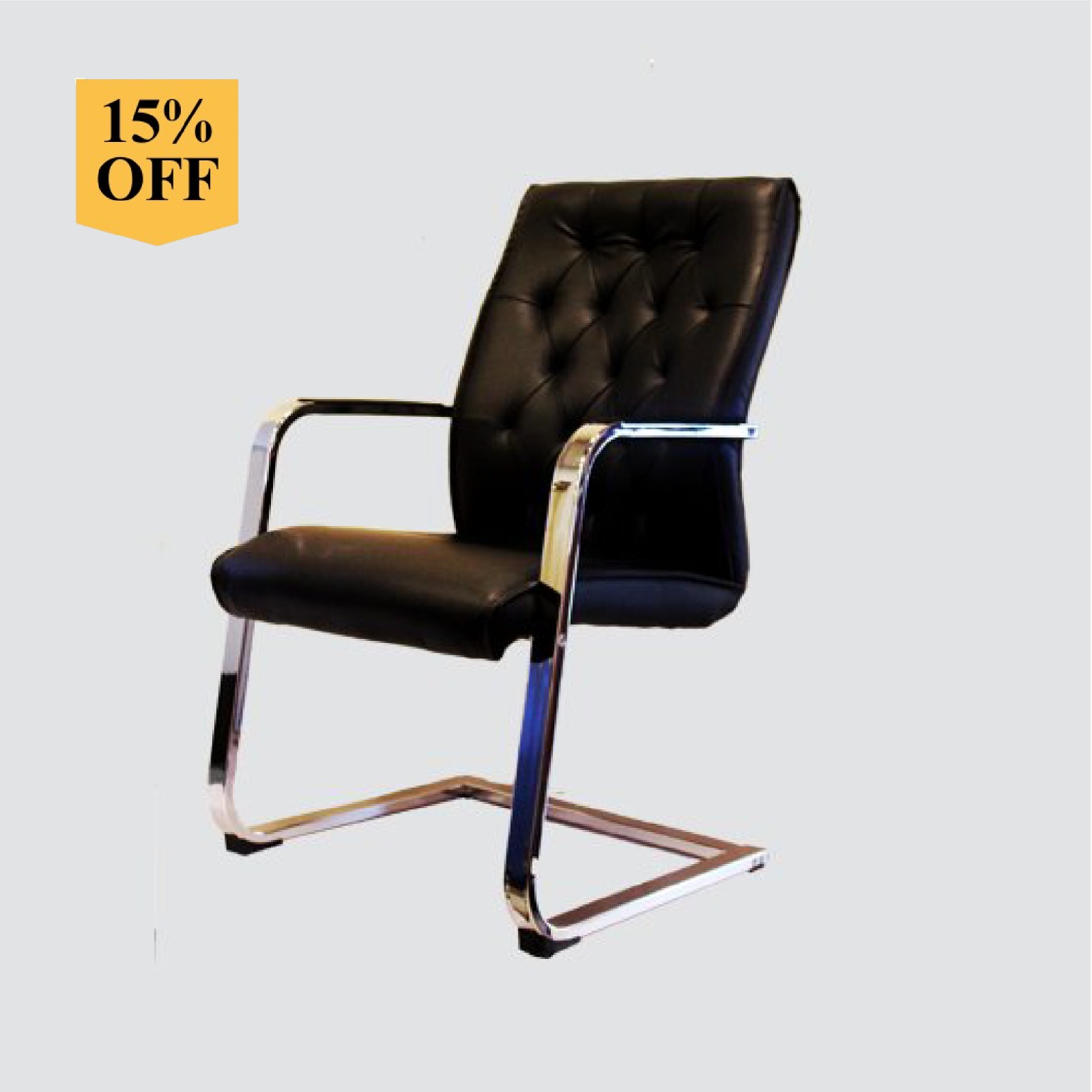 The visitor chair, seat, and backare upholstered in leatherette, premium quality MS chrome coated pipe frame, and leatherette padded armrest.